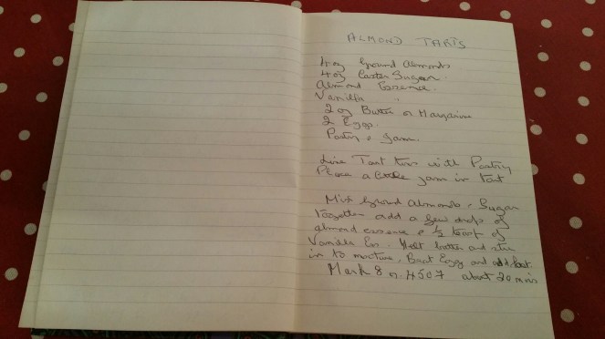 These are similar to bakewell tarts, but with a slightly lighter topping and made with strawberry jam rather than cherry. I’m not sure why this was, or whether these tarts have any other history or link to the similar baked goods from Bakewell but they do taste good! Grandma used to make her own shortcrust pasty for these but hasn’t included the recipe. Any shortcrust pasty would work fine I’m sure.